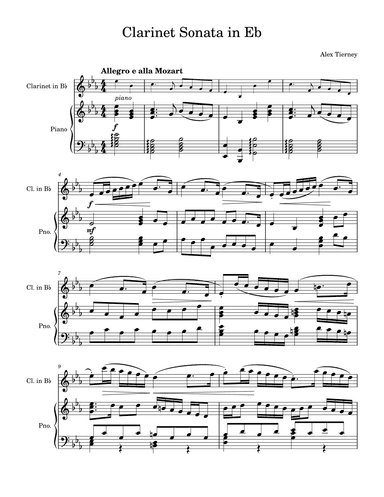 B-Flat Clarinet,Piano - Level 3 - Digital Download SKU: A0.1253771 By Alex Tierney. By Alex Tierney. 21st Century,Classical,Contemporary. Score and part. 12 pages. Alex Tierney #847381. Published by Alex Tierney (A0.1253771). This is a Sonata for clarinet accompanied by piano. This piece is written in a classical style as the tempo and expression marking "Allegro alla Mozart" indicate. I wrote this piece for a clarinetist friend of mine but, even though I play other wind and woodwind instruments, I do not play the clarinet myself. If you would like to purchase this piece written out for an instrument in another key (such as alto sax) please let me know. If you have any feedback, please have it be constructive only and along the lines of improvements, not just what you would prefer. Thank you.This is currently only the first movement, with the score and individual parts included in the PDF. I will write a second and third movement at some point, and if you purchase the first movement before then, you will have that amount deducted from a later purchase of the whole piece.This piece was notated using MuseScore 4 and the MP3 file for listening is also using MuseScore. Due to computers only being so good at this point, the dynamics between the piano and clarinet do not always allow for the easiest hearing of the clarinet part. At the end of the first movement, the high Eb written in the clarinet is not played in the recording.To purchase this piece, please send me an Email.Email: [email protected]. This product was created by a member of ArrangeMe, Hal Leonard’s global self-publishing community of independent composers, arrangers, and songwriters. ArrangeMe allows for the publication of unique arrangements of both popular titles and original compositions from a wide variety of voices and backgrounds. About Digital Downloads Digital Downloads are downloadable sheet music files that can be viewed directly on your computer, tablet or mobile device. Once you download your digital sheet music, you can view and print it at home, school, or anywhere you want to make music, and you don’t have to be connected to the internet. Just purchase, download and play! PLEASE NOTE: Your Digital Download will have a watermark at the bottom of each page that will include your name, purchase date and number of copies purchased. You are only authorized to print the number of copies that you have purchased. You may not digitally distribute or print more copies than purchased for use (i.e., you may not print or digitally distribute individual copies to friends or students).