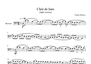 Bassoon,Piano - Level 2 - Digital Download SKU: A0.706005 Composed by Claude Debussy. Arranged by André Laitano. Concert,Instructional,Standards,Wedding. Score and part. 8 pages. ANDRÉ DOS SANTOS #5713297. Published by ANDRÉ DOS SANTOS (A0.706005). Claude Debussy - Clair de lune (Bassoon Solo)Content:Piano Score; Bassoon Solo PartContact me:[email protected]. This product was created by a member of ArrangeMe, Hal Leonard’s global self-publishing community of independent composers, arrangers, and songwriters. ArrangeMe allows for the publication of unique arrangements of both popular titles and original compositions from a wide variety of voices and backgrounds. About Digital Downloads Digital Downloads are downloadable sheet music files that can be viewed directly on your computer, tablet or mobile device. Once you download your digital sheet music, you can view and print it at home, school, or anywhere you want to make music, and you don’t have to be connected to the internet. Just purchase, download and play! PLEASE NOTE: Your Digital Download will have a watermark at the bottom of each page that will include your name, purchase date and number of copies purchased. You are only authorized to print the number of copies that you have purchased. You may not digitally distribute or print more copies than purchased for use (i.e., you may not print or digitally distribute individual copies to friends or students).