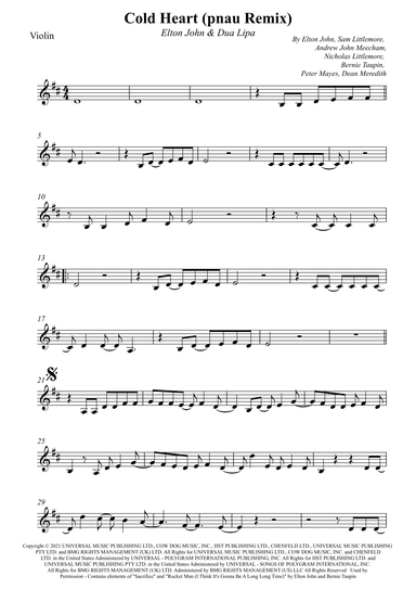 Viola Duet Viola - Level 1 - Digital Download SKU: A0.1311484 By Elton John & Dua Lipa. By Andrew John Meecham, Bernie Taupin, Dean Meredith, Elton John, Nicholas Littlemore, Peter Mayes, and Sam Littlemore. Arranged by RODRIGO BENEDUCCI. Contemporary,Pop,Wedding. Score. 9 pages. Paulo Galvao Filho #900488. Published by Paulo Galvao Filho (A0.1311484). This product was created by a member of ArrangeMe, Hal Leonard's global self-publishing community of independent composers, arrangers, and songwriters. ArrangeMe allows for the publication of unique arrangements of popular titles and original compositions from a variety of voices and backgrounds. The length, difficulty, and retail pricing are determined solely by the discretion of the person who arranged or composed it. About Digital Downloads Digital Downloads are downloadable sheet music files that can be viewed directly on your computer, tablet or mobile device. Once you download your digital sheet music, you can view and print it at home, school, or anywhere you want to make music, and you don’t have to be connected to the internet. Just purchase, download and play! PLEASE NOTE: Your Digital Download will have a watermark at the bottom of each page that will include your name, purchase date and number of copies purchased. You are only authorized to print the number of copies that you have purchased. You may not digitally distribute or print more copies than purchased for use (i.e., you may not print or digitally distribute individual copies to friends or students).