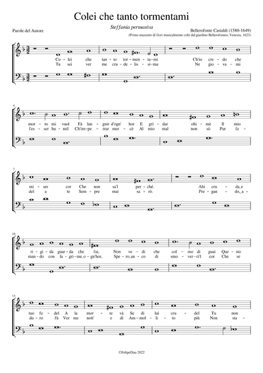 Vocal Solo,Voice - Digital Download SKU: A0.791932 Composed by Bellerofonte Castaldi. Arranged by Early Music Scores. Early Music. 3 pages. Early Music Scores #6829261. Published by Early Music Scores (A0.791932). Voice and continuo.Composed by Bellerofonte Castaldi (1580-1649). From Primo mazzetto di fiori musicalmente colti dal giardino Bellerofonteo, Venezia, 1623. Edited and adapted by Felipe Dias. 3 pages. (Transposed to G minor). This product was created by a member of ArrangeMe, Hal Leonard's global self-publishing community of independent composers, arrangers, and songwriters. ArrangeMe allows for the publication of unique arrangements of popular titles and original compositions from a variety of voices and backgrounds. The length, difficulty, and retail pricing are determined solely by the discretion of the person who arranged or composed it. About Digital Downloads Digital Downloads are downloadable sheet music files that can be viewed directly on your computer, tablet or mobile device. Once you download your digital sheet music, you can view and print it at home, school, or anywhere you want to make music, and you don’t have to be connected to the internet. Just purchase, download and play! PLEASE NOTE: Your Digital Download will have a watermark at the bottom of each page that will include your name, purchase date and number of copies purchased. You are only authorized to print the number of copies that you have purchased. You may not digitally distribute or print more copies than purchased for use (i.e., you may not print or digitally distribute individual copies to friends or students).