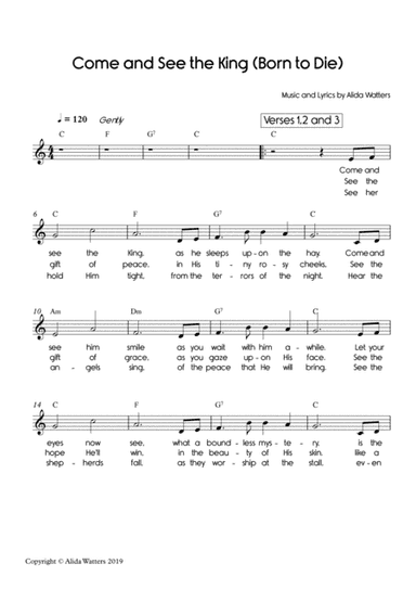 Piano,Vocal,Voice - Digital Download SKU: A0.1029437 Composed by Alida Watters. Christian,Christmas,Sacred. Score. 3 pages. ChromaMusicUK #5008293. Published by ChromaMusicUK (A0.1029437). A brand new Christmas Song for Church or School.Lead sheet and chords. The verses are sweet and sentimental but the chorus takes us on to Easter and the hope that Christ brings, as we let Him be born in us. This product was created by a member of ArrangeMe, Hal Leonard's global self-publishing community of independent composers, arrangers, and songwriters. ArrangeMe allows for the publication of unique arrangements of popular titles and original compositions from a variety of voices and backgrounds. The length, difficulty, and retail pricing are determined solely by the discretion of the person who arranged or composed it. About Digital Downloads Digital Downloads are downloadable sheet music files that can be viewed directly on your computer, tablet or mobile device. Once you download your digital sheet music, you can view and print it at home, school, or anywhere you want to make music, and you don’t have to be connected to the internet. Just purchase, download and play! PLEASE NOTE: Your Digital Download will have a watermark at the bottom of each page that will include your name, purchase date and number of copies purchased. You are only authorized to print the number of copies that you have purchased. You may not digitally distribute or print more copies than purchased for use (i.e., you may not print or digitally distribute individual copies to friends or students).