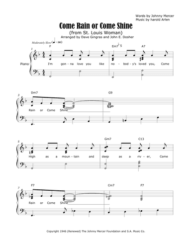 Guitar,Piano,Vocal,Voice - Level 4 - Digital Download SKU: A0.1196712 Composed by Harold Arlen and Johnny Mercer. Arranged by John Fries. 20th Century,Broadway,Jazz,Musical/Show,Standards. Score. 1 pages. John Fries #795875. Published by John Fries (A0.1196712). Please contact me by email at [email protected] to make a special request or to find out all that I have to offer and to express your comments or concerns. You can also type John Fries in the searchbar to see all I have to offer. "Come Rain or Come Shine" is a popular music song, with music by Harold Arlen and lyrics by Johnny Mercer. It was written for the Broadway musical St. Louis Woman, which opened on March 30, 1946, and closed after 113 performances. This product was created by a member of ArrangeMe, Hal Leonard's global self-publishing community of independent composers, arrangers, and songwriters. ArrangeMe allows for the publication of unique arrangements of popular titles and original compositions from a variety of voices and backgrounds. The length, difficulty, and retail pricing are determined solely by the discretion of the person who arranged or composed it. About Digital Downloads Digital Downloads are downloadable sheet music files that can be viewed directly on your computer, tablet or mobile device. Once you download your digital sheet music, you can view and print it at home, school, or anywhere you want to make music, and you don’t have to be connected to the internet. Just purchase, download and play! PLEASE NOTE: Your Digital Download will have a watermark at the bottom of each page that will include your name, purchase date and number of copies purchased. You are only authorized to print the number of copies that you have purchased. You may not digitally distribute or print more copies than purchased for use (i.e., you may not print or digitally distribute individual copies to friends or students).