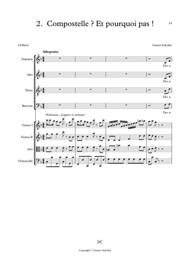 Strings Choir - Level 3 - Digital Download SKU: A0.1016076 Composed by Gunter Scholler. 20th Century,Classical,Contemporary,Praise & Worship. 12 pages. Scholler #5297821. Published by Scholler (A0.1016076). POPULAR AND GROOVY IN THE FIRST PART, WITH A BARBARIAN RHYTHM IN THE SECOND PART for mixed choir & stringsBig choir and String Orchestra Great music for Live-performancesmovement number 2 of "R E I S E N D E D E S J A K O B S W E G E S " 8 songs that symbolize the travelers of the Way of St. James. From Germany to Spain, catchy songs in 4 different languages: Latin, French, German and SpainThe entire work contains: 1. MIGRANDI, (catchy tune), Ends with a lot of sound S/S/A/A/T/T/B/B Latin2. COMPOSTELLE ? POURQUOI PAS ? (Leggiero & animato), French3. LA CHANSON DU DEVOIR DU PELERIN (spiritual song on dancing strings), French4. WANDERSCHAFT ( rhythmic play), german5. EIN TOAST DIESER FREUNDESRUNDE (solemn and measured), german and french6. O DULCIS VIRGO (modern-classical spiritual , Ave Maria contemporary), latin7. QUIS SCIT ? (imposing and "con brio " for the strings), latin8. CAMINANTE (Spanish sound and a lot of joy in singing ) spanishEmbrace the transformative power of musichttps://linktr.ee/schollermusicUnleash the power of multilingual musical expression with our captivating score for choir and string orchestra. This exceptional composition spans the realms of classical to modern, seamlessly blending languages such as French, German, Spanish, and Latin to create a truly international experience. Immerse yourself in the richness of these diverse linguistic tapestries, as the voices intertwine with the vibrant strings, creating a harmonious fusion of cultures. Perfect for ensembles seeking to showcase their versatility and celebrate the beauty of global languages, this score opens doors to a world of musical exploration. From elegant classical passages to contemporary twists, let the voices and strings transport you on a captivating journey through time and language. Embrace the magic of cultural diversity and musical unity with this extraordinary choral and orchestral masterpiece. This product was created by a member of ArrangeMe, Hal Leonard’s global self-publishing community of independent composers, arrangers, and songwriters. ArrangeMe allows for the publication of unique arrangements of both popular titles and original compositions from a wide variety of voices and backgrounds. About Digital Downloads Digital Downloads are downloadable sheet music files that can be viewed directly on your computer, tablet or mobile device. Once you download your digital sheet music, you can view and print it at home, school, or anywhere you want to make music, and you don’t have to be connected to the internet. Just purchase, download and play! PLEASE NOTE: Your Digital Download will have a watermark at the bottom of each page that will include your name, purchase date and number of copies purchased. You are only authorized to print the number of copies that you have purchased. You may not digitally distribute or print more copies than purchased for use (i.e., you may not print or digitally distribute individual copies to friends or students).