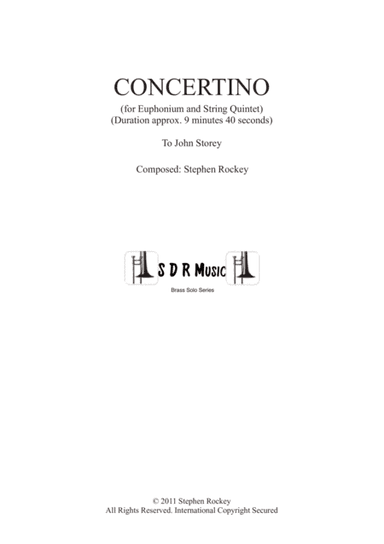 String Ensemble,String Quintet - Level 5 - Digital Download SKU: A0.761057 Composed by Stephen Rockey. Concert,Contemporary. Score and parts. 81 pages. Stephen Rockey #4301795. Published by Stephen Rockey (A0.761057). Concertino for Euphonium and String Quintet, premiered in 2011 in the Guard's Chapel, London UK. Written for John Storey, it is not an easy piece and last approximately 10 minutes. There is also a version with a piano reduction accompaniment. This product was created by a member of ArrangeMe, Hal Leonard’s global self-publishing community of independent composers, arrangers, and songwriters. ArrangeMe allows for the publication of unique arrangements of both popular titles and original compositions from a wide variety of voices and backgrounds. About Digital Downloads Digital Downloads are downloadable sheet music files that can be viewed directly on your computer, tablet or mobile device. Once you download your digital sheet music, you can view and print it at home, school, or anywhere you want to make music, and you don’t have to be connected to the internet. Just purchase, download and play! PLEASE NOTE: Your Digital Download will have a watermark at the bottom of each page that will include your name, purchase date and number of copies purchased. You are only authorized to print the number of copies that you have purchased. You may not digitally distribute or print more copies than purchased for use (i.e., you may not print or digitally distribute individual copies to friends or students).