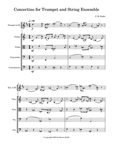 B-Flat Trumpet,Cello,Double Bass,Viola,Violin - Level 3 - Digital Download SKU: A0.1259122 Composed by Steven Kudlo. 20th Century,21st Century,Classical,Contemporary. 54 pages. Steven Mark Kudlo #852391. Published by Steven Mark Kudlo (A0.1259122). A small concerto in five movements for Bb trumpet with violins (one section), violas, cellos, and basses. Of intermediate difficulty, with neo-romantic sounds, slightly contemporary. About 17 minutes long. Melody is alternated between trumpet and violins. Fairly rich sounds. This product was created by a member of ArrangeMe, Hal Leonard’s global self-publishing community of independent composers, arrangers, and songwriters. ArrangeMe allows for the publication of unique arrangements of both popular titles and original compositions from a wide variety of voices and backgrounds. About Digital Downloads Digital Downloads are downloadable sheet music files that can be viewed directly on your computer, tablet or mobile device. Once you download your digital sheet music, you can view and print it at home, school, or anywhere you want to make music, and you don’t have to be connected to the internet. Just purchase, download and play! PLEASE NOTE: Your Digital Download will have a watermark at the bottom of each page that will include your name, purchase date and number of copies purchased. You are only authorized to print the number of copies that you have purchased. You may not digitally distribute or print more copies than purchased for use (i.e., you may not print or digitally distribute individual copies to friends or students).