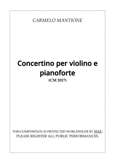 Instrumental Duet Instrumental Duet,Piano,Violin - Level 3 - Digital Download SKU: A0.1012944 Composed by Carmelo Mantione. 20th Century,Children,Contemporary,Standards,World. Score and parts. 30 pages. Carmelo Mantione #5799643. Published by Carmelo Mantione (A0.1012944). Concertino for violin and piano. Is possible to play in 1th position. Allegro-Adagio-Vivace This product was created by a member of ArrangeMe, Hal Leonard's global self-publishing community of independent composers, arrangers, and songwriters. ArrangeMe allows for the publication of unique arrangements of popular titles and original compositions from a variety of voices and backgrounds. The length, difficulty, and retail pricing are determined solely by the discretion of the person who arranged or composed it. About Digital Downloads Digital Downloads are downloadable sheet music files that can be viewed directly on your computer, tablet or mobile device. Once you download your digital sheet music, you can view and print it at home, school, or anywhere you want to make music, and you don’t have to be connected to the internet. Just purchase, download and play! PLEASE NOTE: Your Digital Download will have a watermark at the bottom of each page that will include your name, purchase date and number of copies purchased. You are only authorized to print the number of copies that you have purchased. You may not digitally distribute or print more copies than purchased for use (i.e., you may not print or digitally distribute individual copies to friends or students).