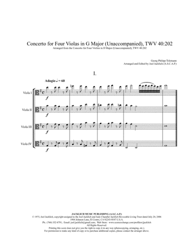 String Quartet String Quartet,Viola - Level 3 - Digital Download SKU: A0.723154 Composed by Georg Philipp Telemann. Arranged by Joel Jacklich (ASCAP). Baroque,Concert. Score and parts. 26 pages. Joel Jacklich #5354939. Published by Joel Jacklich (A0.723154). Georg Philipp Telemann wrote four concerti for four violins unaccompanied: TWV40:201-204.  This is the second of these, TWV40:202, originally in D Major for violins, the key has been changed to G Major to allow the same fingerings and string crossings as the violin version. This product was created by a member of ArrangeMe, Hal Leonard's global self-publishing community of independent composers, arrangers, and songwriters. ArrangeMe allows for the publication of unique arrangements of popular titles and original compositions from a variety of voices and backgrounds. The length, difficulty, and retail pricing are determined solely by the discretion of the person who arranged or composed it. About Digital Downloads Digital Downloads are downloadable sheet music files that can be viewed directly on your computer, tablet or mobile device. Once you download your digital sheet music, you can view and print it at home, school, or anywhere you want to make music, and you don’t have to be connected to the internet. Just purchase, download and play! PLEASE NOTE: Your Digital Download will have a watermark at the bottom of each page that will include your name, purchase date and number of copies purchased. You are only authorized to print the number of copies that you have purchased. You may not digitally distribute or print more copies than purchased for use (i.e., you may not print or digitally distribute individual copies to friends or students).