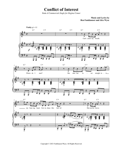 Piano,Vocal,Voice - Level 4 - Digital Download SKU: A0.1095850 By Ben Fankhauser. By Alex Wyse and Ben Fankhauser. Broadway,Musical/Show. Score. 7 pages. Fankhauser & Wyse #699818. Published by Fankhauser & Wyse (A0.1095850). From A Commercial Jingle For Regina Comet. This product was created by a member of ArrangeMe, Hal Leonard's global self-publishing community of independent composers, arrangers, and songwriters. ArrangeMe allows for the publication of unique arrangements of popular titles and original compositions from a variety of voices and backgrounds. The length, difficulty, and retail pricing are determined solely by the discretion of the person who arranged or composed it. About Digital Downloads Digital Downloads are downloadable sheet music files that can be viewed directly on your computer, tablet or mobile device. Once you download your digital sheet music, you can view and print it at home, school, or anywhere you want to make music, and you don’t have to be connected to the internet. Just purchase, download and play! PLEASE NOTE: Your Digital Download will have a watermark at the bottom of each page that will include your name, purchase date and number of copies purchased. You are only authorized to print the number of copies that you have purchased. You may not digitally distribute or print more copies than purchased for use (i.e., you may not print or digitally distribute individual copies to friends or students).