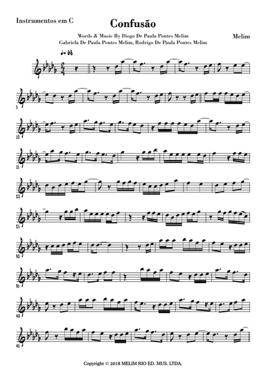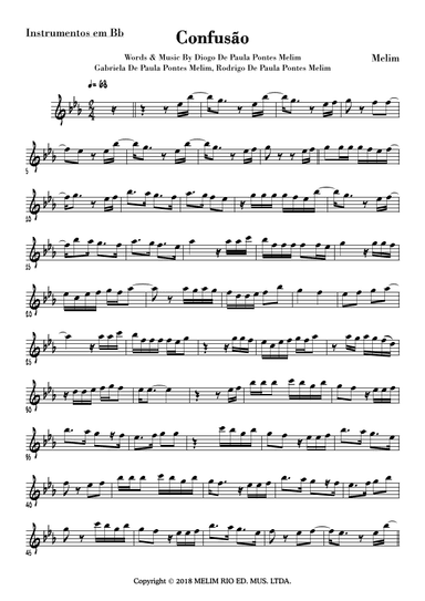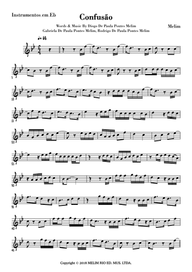 Tenor Saxophone Solo - Level 2 - Digital Download SKU: A0.498939 By Melim. By Diogo De Paula Pontes Melim, Gabriela De Paula Pontes Melim, and Rodrigo De Paula Pontes Melim. Arranged by Escrita Musical. Pop. Individual part. 2 pages. Sheet Music Pro #112399. Published by Sheet Music Pro (A0.498939). Partitura solo para "Instrumentos em Bb". Música: Confusão banda Melim. This product was created by a member of ArrangeMe, Hal Leonard’s global self-publishing community of independent composers, arrangers, and songwriters. ArrangeMe allows for the publication of unique arrangements of both popular titles and original compositions from a wide variety of voices and backgrounds. About Digital Downloads Digital Downloads are downloadable sheet music files that can be viewed directly on your computer, tablet or mobile device. Once you download your digital sheet music, you can view and print it at home, school, or anywhere you want to make music, and you don’t have to be connected to the internet. Just purchase, download and play! PLEASE NOTE: Your Digital Download will have a watermark at the bottom of each page that will include your name, purchase date and number of copies purchased. You are only authorized to print the number of copies that you have purchased. You may not digitally distribute or print more copies than purchased for use (i.e., you may not print or digitally distribute individual copies to friends or students).