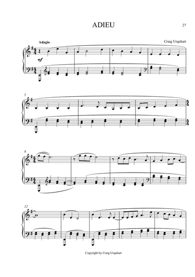 Piano Solo - Level 2 - Digital Download SKU: A0.891415 Composed by Craig Urquhart. 20th Century,Instructional,New Age,Standards. Score. 4 pages. Craig URQUHART #6330351. Published by Craig URQUHART (A0.891415). Thoughtful, moody, solo piano. This product was created by a member of ArrangeMe, Hal Leonard’s global self-publishing community of independent composers, arrangers, and songwriters. ArrangeMe allows for the publication of unique arrangements of both popular titles and original compositions from a wide variety of voices and backgrounds. About Digital Downloads Digital Downloads are downloadable sheet music files that can be viewed directly on your computer, tablet or mobile device. Once you download your digital sheet music, you can view and print it at home, school, or anywhere you want to make music, and you don’t have to be connected to the internet. Just purchase, download and play! PLEASE NOTE: Your Digital Download will have a watermark at the bottom of each page that will include your name, purchase date and number of copies purchased. You are only authorized to print the number of copies that you have purchased. You may not digitally distribute or print more copies than purchased for use (i.e., you may not print or digitally distribute individual copies to friends or students).