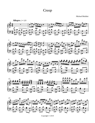 B-Flat Trumpet Solo - Level 2 - Digital Download SKU: A0.1273705 By Radiohead. By Albert Hammond, Colin Greenwood, Edward O'Brien, Jonathan Greenwood, Mike Hazlewood, Philip Selway, and Thomas Yorke. Arranged by Daniel Nakamura. Contemporary,Grunge,Instructional,Pop,Rock. Individual part. 2 pages. Daniel Nakamura #865850. Published by Daniel Nakamura (A0.1273705). Arrangement of Creep (Radiohead) for violin solo. With lyrics and chords. Key of G. This product was created by a member of ArrangeMe, Hal Leonard’s global self-publishing community of independent composers, arrangers, and songwriters. ArrangeMe allows for the publication of unique arrangements of both popular titles and original compositions from a wide variety of voices and backgrounds. About Digital Downloads Digital Downloads are downloadable sheet music files that can be viewed directly on your computer, tablet or mobile device. Once you download your digital sheet music, you can view and print it at home, school, or anywhere you want to make music, and you don’t have to be connected to the internet. Just purchase, download and play! PLEASE NOTE: Your Digital Download will have a watermark at the bottom of each page that will include your name, purchase date and number of copies purchased. You are only authorized to print the number of copies that you have purchased. You may not digitally distribute or print more copies than purchased for use (i.e., you may not print or digitally distribute individual copies to friends or students).