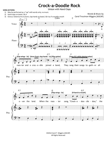 Choral Choir (Unison) - Level 1 - Digital Download SKU: A0.727103 Composed by Carol Troutman Wiggins. Children,Comedy,Folk,Instructional,Rock. Octavo. 3 pages. Carol Troutman Wiggins #2897333. Published by Carol Troutman Wiggins (A0.727103). Unison with Hand ClapsRockin' accompaniment supports the fun melody & text about a rooster and a crocodile and formed a band! Add the actions and this song is sure to be a hit with kids and audiences alike! Hand claps on beats 2 & 4 add to the excitement, especially when they clap with their arms extended to the front like a crocodile snapping!Need something different? Say the words as a rap - no music, only beats! This product was created by a member of ArrangeMe, Hal Leonard’s global self-publishing community of independent composers, arrangers, and songwriters. ArrangeMe allows for the publication of unique arrangements of both popular titles and original compositions from a wide variety of voices and backgrounds. About Digital Downloads Digital Downloads are downloadable sheet music files that can be viewed directly on your computer, tablet or mobile device. Once you download your digital sheet music, you can view and print it at home, school, or anywhere you want to make music, and you don’t have to be connected to the internet. Just purchase, download and play! PLEASE NOTE: Your Digital Download will have a watermark at the bottom of each page that will include your name, purchase date and number of copies purchased. You are only authorized to print the number of copies that you have purchased. You may not digitally distribute or print more copies than purchased for use (i.e., you may not print or digitally distribute individual copies to friends or students).