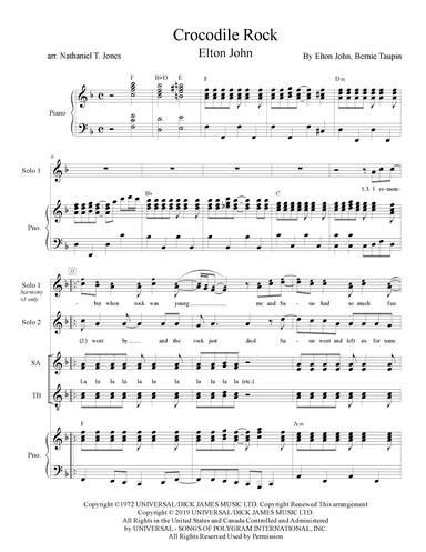 Saxophone Trio,Woodwind Ensemble Alto Saxophone,Soprano Saxophone,Tenor Saxophone - Level 3 - Digital Download SKU: A0.738974 By Elton John. By Bernie Taupin and Elton John. Arranged by Kayleigh Huelin. Pop,Rock. 8 pages. Kayleigh Huelin #6487147. Published by Kayleigh Huelin (A0.738974). Elton John's great retro-hit 'Crocodile Rock' arranged for SAT/AAT saxophone trio. Like this? Why not check out my website for more saxophone arrangements: www.khuelinmusic.co.uk This product was created by a member of ArrangeMe, Hal Leonard’s global self-publishing community of independent composers, arrangers, and songwriters. ArrangeMe allows for the publication of unique arrangements of both popular titles and original compositions from a wide variety of voices and backgrounds. About Digital Downloads Digital Downloads are downloadable sheet music files that can be viewed directly on your computer, tablet or mobile device. Once you download your digital sheet music, you can view and print it at home, school, or anywhere you want to make music, and you don’t have to be connected to the internet. Just purchase, download and play! PLEASE NOTE: Your Digital Download will have a watermark at the bottom of each page that will include your name, purchase date and number of copies purchased. You are only authorized to print the number of copies that you have purchased. You may not digitally distribute or print more copies than purchased for use (i.e., you may not print or digitally distribute individual copies to friends or students).