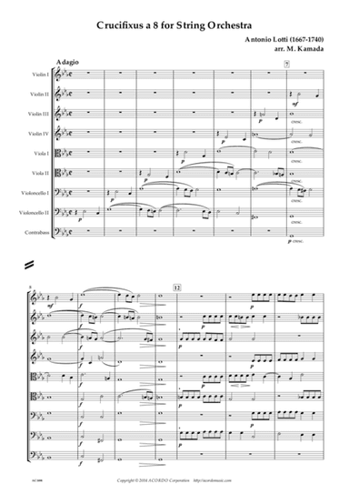 Choral Choir (SSAA) - Level 4 - Digital Download SKU: A0.925030 Composed by Antonio Lotti. Arranged by Gabriel Sung. Baroque,Praise & Worship,Sacred. Octavo. 9 pages. Gabriel Bachmanov #4279157. Published by Gabriel Bachmanov (A0.925030). Originally written for 8-part SSAATTBB chorus/madrigal ensembles, the famous Crucifixus was widely known for its beautiful harmonies and blending of voices. Now, with an arrangement of the piece suitable for female choruses,  Crucifixus a 8 is now represented and ready for challenges by any ambitious intermediate to advanced female choirs. This product was created by a member of ArrangeMe, Hal Leonard's global self-publishing community of independent composers, arrangers, and songwriters. ArrangeMe allows for the publication of unique arrangements of popular titles and original compositions from a variety of voices and backgrounds. The length, difficulty, and retail pricing are determined solely by the discretion of the person who arranged or composed it. About Digital Downloads Digital Downloads are downloadable sheet music files that can be viewed directly on your computer, tablet or mobile device. Once you download your digital sheet music, you can view and print it at home, school, or anywhere you want to make music, and you don’t have to be connected to the internet. Just purchase, download and play! PLEASE NOTE: Your Digital Download will have a watermark at the bottom of each page that will include your name, purchase date and number of copies purchased. You are only authorized to print the number of copies that you have purchased. You may not digitally distribute or print more copies than purchased for use (i.e., you may not print or digitally distribute individual copies to friends or students).