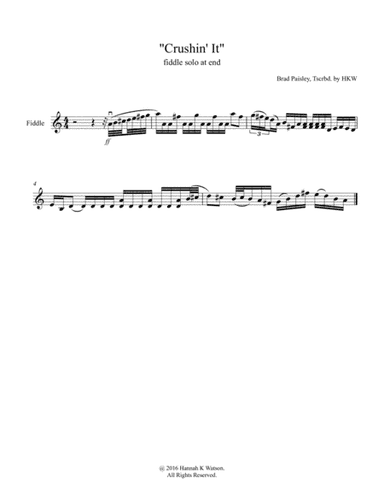Violin Solo - Level 4 - Digital Download SKU: A0.892440 By Jerrod Niemann. By Brad Paisley, Kelley Lovelace, and Lee Thomas Miller. Arranged by Hannah K Watson. Contemporary,Contest,Country,Festival,Instructional,Rock. 1 pages. Hannah K Watson #4638721. Published by Hannah K Watson (A0.892440). The brief yet awesome fiddle solo at the very end of Brad Paisley's famous song "CRUSHIN' IT", notated & available as a PDF download. Includes PDF of the individual part (1 page total). Duration roughly 0:15. Many/most dynamics and articulations were left out intentionally for learning purposes for students and/or personal interpretation of the music. Contact me if any of the following is desired: -change of key -change of instrumentation -instrumentation additions or subtractions -other alterations Find more sheet music here - https://www.hannahkwatson.com/sheetmusic Contact me directly with specific request(s) - https://www.hannahkwatson.com/contact **Copyright Statement** The sale of this transcribed-by-ear sheet music document is not intended to infringe upon any copyright laws in any way. This transcription/arrangement was heard and written down from my ears alone and at the discretion of my sole interpretation of the song as an arrangement, to be played live, as a "cover" of the original song. The original content of this song is the copyrighted property of its respective owner(s). This product was created by a member of ArrangeMe, Hal Leonard's global self-publishing community of independent composers, arrangers, and songwriters. ArrangeMe allows for the publication of unique arrangements of popular titles and original compositions from a variety of voices and backgrounds. The length, difficulty, and retail pricing are determined solely by the discretion of the person who arranged or composed it. About Digital Downloads Digital Downloads are downloadable sheet music files that can be viewed directly on your computer, tablet or mobile device. Once you download your digital sheet music, you can view and print it at home, school, or anywhere you want to make music, and you don’t have to be connected to the internet. Just purchase, download and play! PLEASE NOTE: Your Digital Download will have a watermark at the bottom of each page that will include your name, purchase date and number of copies purchased. You are only authorized to print the number of copies that you have purchased. You may not digitally distribute or print more copies than purchased for use (i.e., you may not print or digitally distribute individual copies to friends or students).