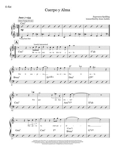 Instrumental Duet Alto Saxophone,Baritone Saxophone,Instrumental Duet - Level 5 - Digital Download SKU: A0.961818 By Esperanza Spalding. By John Green. Arranged by Jesse Audelo. Contemporary. Score and parts. 4 pages. Jesse Audelo #6214095. Published by Jesse Audelo (A0.961818). Cuerpo Y Alma (Body And Soul) as performed by Esperanza Spalding - E-flat Lead Sheet. This product was created by a member of ArrangeMe, Hal Leonard's global self-publishing community of independent composers, arrangers, and songwriters. ArrangeMe allows for the publication of unique arrangements of popular titles and original compositions from a variety of voices and backgrounds. The length, difficulty, and retail pricing are determined solely by the discretion of the person who arranged or composed it. About Digital Downloads Digital Downloads are downloadable sheet music files that can be viewed directly on your computer, tablet or mobile device. Once you download your digital sheet music, you can view and print it at home, school, or anywhere you want to make music, and you don’t have to be connected to the internet. Just purchase, download and play! PLEASE NOTE: Your Digital Download will have a watermark at the bottom of each page that will include your name, purchase date and number of copies purchased. You are only authorized to print the number of copies that you have purchased. You may not digitally distribute or print more copies than purchased for use (i.e., you may not print or digitally distribute individual copies to friends or students).