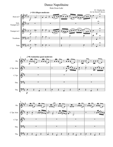 Brass Quintet - Level 5 - Digital Download SKU: A0.1308104 By David P. Brown. By Peter Ilyich Tchaikovsky. Arranged by David P. Brown. 19th Century,Chamber,Classical,Romantic Period,Wedding. 17 pages. David P. Brown #897378. Published by David P. Brown (A0.1308104). This is a showpiece for the 1st trumpet, but everyone has something to do in this fun showstopper! Suitable for all occasions including concerts, prelude and postlude music, weddings, and commencements. This product was created by a member of ArrangeMe, Hal Leonard's global self-publishing community of independent composers, arrangers, and songwriters. ArrangeMe allows for the publication of unique arrangements of popular titles and original compositions from a variety of voices and backgrounds. The length, difficulty, and retail pricing are determined solely by the discretion of the person who arranged or composed it. About Digital Downloads Digital Downloads are downloadable sheet music files that can be viewed directly on your computer, tablet or mobile device. Once you download your digital sheet music, you can view and print it at home, school, or anywhere you want to make music, and you don’t have to be connected to the internet. Just purchase, download and play! PLEASE NOTE: Your Digital Download will have a watermark at the bottom of each page that will include your name, purchase date and number of copies purchased. You are only authorized to print the number of copies that you have purchased. You may not digitally distribute or print more copies than purchased for use (i.e., you may not print or digitally distribute individual copies to friends or students).