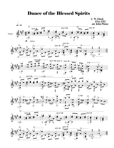 Solo Guitar - Level 4 - Digital Download SKU: A0.775360 Composed by Chistoph Willibald Gluck. Arranged by John Pinno. Classical,Concert,Contemporary,Wedding. Individual part. 1 pages. John Pinno #2032995. Published by John Pinno (A0.775360). From the second act of the 1762 opera Orfeo and Euridice by Chistoph Willibald Gluck, this piece for solo classical guitar makes use of notes in the higher positions on the fingerboard for expressive effect.For any questions or comments email John Pinno at [email protected] also check out some of my other arrangements on Sheet Music Plus for classical guitar solo, and also duos for guitar with flute or voice: https://www.sheetmusicplus.com/publishers/john-pinno-sheet-music/3002745 This product was created by a member of ArrangeMe, Hal Leonard’s global self-publishing community of independent composers, arrangers, and songwriters. ArrangeMe allows for the publication of unique arrangements of both popular titles and original compositions from a wide variety of voices and backgrounds. About Digital Downloads Digital Downloads are downloadable sheet music files that can be viewed directly on your computer, tablet or mobile device. Once you download your digital sheet music, you can view and print it at home, school, or anywhere you want to make music, and you don’t have to be connected to the internet. Just purchase, download and play! PLEASE NOTE: Your Digital Download will have a watermark at the bottom of each page that will include your name, purchase date and number of copies purchased. You are only authorized to print the number of copies that you have purchased. You may not digitally distribute or print more copies than purchased for use (i.e., you may not print or digitally distribute individual copies to friends or students).