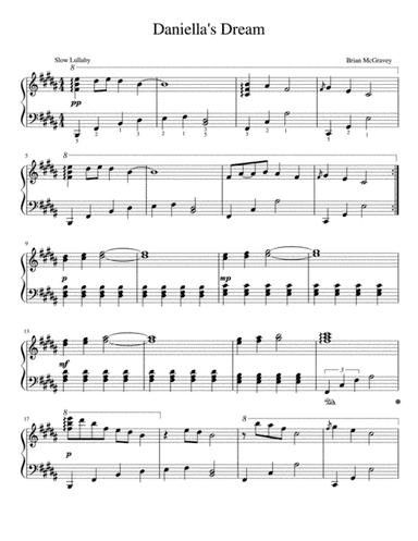 Piano Solo - Digital Download SKU: A0.894726 Composed by Brian McGravey. Children,Contemporary,Holiday,Standards,World. Score. 2 pages. Brian McGravey #3640385. Published by Brian McGravey (A0.894726). This lullaby was written for the composer's newborn daughter Daniella. It was intended to help her relax and sleep and it worked so well that now it is available to the world! This product was created by a member of ArrangeMe, Hal Leonard's global self-publishing community of independent composers, arrangers, and songwriters. ArrangeMe allows for the publication of unique arrangements of popular titles and original compositions from a variety of voices and backgrounds. The length, difficulty, and retail pricing are determined solely by the discretion of the person who arranged or composed it. About Digital Downloads Digital Downloads are downloadable sheet music files that can be viewed directly on your computer, tablet or mobile device. Once you download your digital sheet music, you can view and print it at home, school, or anywhere you want to make music, and you don’t have to be connected to the internet. Just purchase, download and play! PLEASE NOTE: Your Digital Download will have a watermark at the bottom of each page that will include your name, purchase date and number of copies purchased. You are only authorized to print the number of copies that you have purchased. You may not digitally distribute or print more copies than purchased for use (i.e., you may not print or digitally distribute individual copies to friends or students).