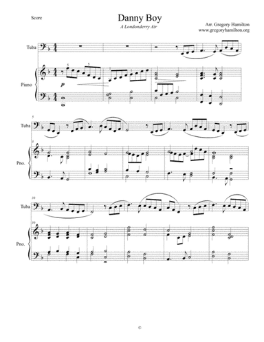 Piano,Tuba - Digital Download SKU: A0.771807 Arranged by Gregory Hamilton. Contemporary. Score and part. 4 pages. Dr. Gregory Hamilton #2913057. Published by Dr. Gregory Hamilton (A0.771807). Danny Boy, a Londonderry Air arranged for Tuba and Piano.www.gregoryhamilton.org This product was created by a member of ArrangeMe, Hal Leonard’s global self-publishing community of independent composers, arrangers, and songwriters. ArrangeMe allows for the publication of unique arrangements of both popular titles and original compositions from a wide variety of voices and backgrounds. About Digital Downloads Digital Downloads are downloadable sheet music files that can be viewed directly on your computer, tablet or mobile device. Once you download your digital sheet music, you can view and print it at home, school, or anywhere you want to make music, and you don’t have to be connected to the internet. Just purchase, download and play! PLEASE NOTE: Your Digital Download will have a watermark at the bottom of each page that will include your name, purchase date and number of copies purchased. You are only authorized to print the number of copies that you have purchased. You may not digitally distribute or print more copies than purchased for use (i.e., you may not print or digitally distribute individual copies to friends or students).