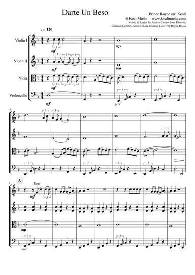 String Trio Cello,Viola,Violin - Level 3 - Digital Download SKU: A0.1255151 By Prince Royce. By Andres Castro, Geoffrey Royce Rojas, Guianko Gomez, Juan De Rosa Riveros, and Juan Riveros. Arranged by KoaliMusic. Latin,Multicultural,Pop,World. 7 pages. Koali #848716. Published by Koali (A0.1255151). String Trio of the worldwide Bachata hit Darte Un Beso by Prince Royce. With over 1 Billion streams this is one of the most popular songs from one of the most popular latin artists; this Bachata song is played on dancefloors worldwide. This string trio has 3 interesting parts: violin 1 mostly the tune, viola the guitars and counter melodies, and cello the classic dominican basslines. Written by a latin dancing viola player, this is an instantly recognisable trio, all parts are bowed with dynamics, and each prints to a single page. There are several other KoaliMusic latin pop trios and quartets available too! This product was created by a member of ArrangeMe, Hal Leonard's global self-publishing community of independent composers, arrangers, and songwriters. ArrangeMe allows for the publication of unique arrangements of popular titles and original compositions from a variety of voices and backgrounds. The length, difficulty, and retail pricing are determined solely by the discretion of the person who arranged or composed it. About Digital Downloads Digital Downloads are downloadable sheet music files that can be viewed directly on your computer, tablet or mobile device. Once you download your digital sheet music, you can view and print it at home, school, or anywhere you want to make music, and you don’t have to be connected to the internet. Just purchase, download and play! PLEASE NOTE: Your Digital Download will have a watermark at the bottom of each page that will include your name, purchase date and number of copies purchased. You are only authorized to print the number of copies that you have purchased. You may not digitally distribute or print more copies than purchased for use (i.e., you may not print or digitally distribute individual copies to friends or students).
