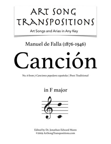 Piano,Vocal,Voice - Digital Download SKU: A0.538947 Composed by Manuel de Falla. Arranged by ArtSongTranspositions.com. Romantic Period. Score. 6 pages. AST Publications, LLC #4898189. Published by AST Publications, LLC (A0.538947). ⇨ PAY $0.00 with INSTITUTIONAL MEMBERSHIP✓ 10,000+ art songs and Baroque aria PDFs✓ Transpose sheet music to any key✓ Free for faculty, students, staff, and employees✓ Campus-wide access via IP authentication✓ Off-campus access via EZproxy or SAML This product was created by a member of ArrangeMe, Hal Leonard's global self-publishing community of independent composers, arrangers, and songwriters. ArrangeMe allows for the publication of unique arrangements of popular titles and original compositions from a variety of voices and backgrounds. The length, difficulty, and retail pricing are determined solely by the discretion of the person who arranged or composed it. About Digital Downloads Digital Downloads are downloadable sheet music files that can be viewed directly on your computer, tablet or mobile device. Once you download your digital sheet music, you can view and print it at home, school, or anywhere you want to make music, and you don’t have to be connected to the internet. Just purchase, download and play! PLEASE NOTE: Your Digital Download will have a watermark at the bottom of each page that will include your name, purchase date and number of copies purchased. You are only authorized to print the number of copies that you have purchased. You may not digitally distribute or print more copies than purchased for use (i.e., you may not print or digitally distribute individual copies to friends or students).