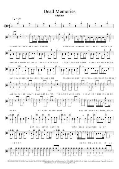 Drums - Level 4 - Digital Download SKU: A0.1168431 By Slipknot. By Slipknot. Arranged by Cyril Mayer. Rock. Score. 4 pages. Cyril Mayer #768763. Published by Cyril Mayer (A0.1168431). Dead Memories - Slipknot - Drum Transcript + lyrics. This product was created by a member of ArrangeMe, Hal Leonard’s global self-publishing community of independent composers, arrangers, and songwriters. ArrangeMe allows for the publication of unique arrangements of both popular titles and original compositions from a wide variety of voices and backgrounds. About Digital Downloads Digital Downloads are downloadable sheet music files that can be viewed directly on your computer, tablet or mobile device. Once you download your digital sheet music, you can view and print it at home, school, or anywhere you want to make music, and you don’t have to be connected to the internet. Just purchase, download and play! PLEASE NOTE: Your Digital Download will have a watermark at the bottom of each page that will include your name, purchase date and number of copies purchased. You are only authorized to print the number of copies that you have purchased. You may not digitally distribute or print more copies than purchased for use (i.e., you may not print or digitally distribute individual copies to friends or students).