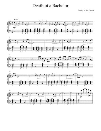 Interactive Download SKU: HX.383241 By Panic! At the Disco. This edition: Interactive Download. Pop. Piano/Vocal/Guitar (Piano Accompaniment). 5 pages. Published by Hal Leonard Europe (HX.383241). About Interactive Downloads Interactive Downloads are dynamic sheet music files that can be viewed and altered directly in My Digital Library from any device. Interactive features include: playback, tempo control, transposition, melody instrument selection, adjustable note size, and full-screen viewing. Once you download your personalized sheet music, you can view and print it at home, school, or anywhere you want to make music, and you don’t have to be connected to the internet. Just purchase, download and play! PLEASE NOTE: All Interactive Downloads will have a watermark at the bottom of each page that will include your name, purchase date and number of copies purchased. You are only authorized to print the number of copies that you have purchased. You may not digitally distribute or print more copies than purchased for use (i.e., you may not print or digitally distribute individual copies to friends or students).