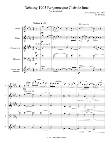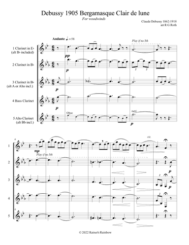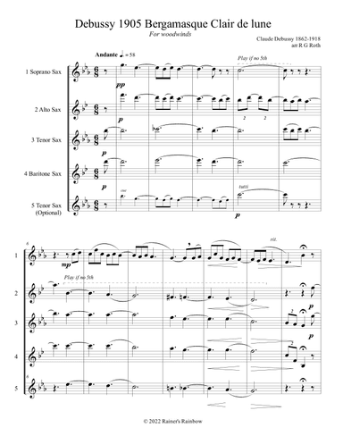 Saxophone Quartet,Woodwind Ensemble Alto Saxophone,Baritone Saxophone,Soprano Saxophone,Tenor Saxophone - Level 4 - Digital Download SKU: A0.1088710 By Rainer's Rainbow. By Claude Debussy 1862-1918. Arranged by R G Roth. 20th Century,Classical,Jazz,Romantic Period,Wedding. 24 pages. Rainer's Rainbow #692918. Published by Rainer's Rainbow (A0.1088710). In 1905 Debussy wrote his most famous melody Clair de lune. It has been arranged here for Sax quartet SATB. For the first time the arrangement follows the original piano score in Db from beginning to end. It can also be played as a quintet or sax choir by adding the optional 5th player on Tenor. This product was created by a member of ArrangeMe, Hal Leonard's global self-publishing community of independent composers, arrangers, and songwriters. ArrangeMe allows for the publication of unique arrangements of popular titles and original compositions from a variety of voices and backgrounds. The length, difficulty, and retail pricing are determined solely by the discretion of the person who arranged or composed it. About Digital Downloads Digital Downloads are downloadable sheet music files that can be viewed directly on your computer, tablet or mobile device. Once you download your digital sheet music, you can view and print it at home, school, or anywhere you want to make music, and you don’t have to be connected to the internet. Just purchase, download and play! PLEASE NOTE: Your Digital Download will have a watermark at the bottom of each page that will include your name, purchase date and number of copies purchased. You are only authorized to print the number of copies that you have purchased. You may not digitally distribute or print more copies than purchased for use (i.e., you may not print or digitally distribute individual copies to friends or students).