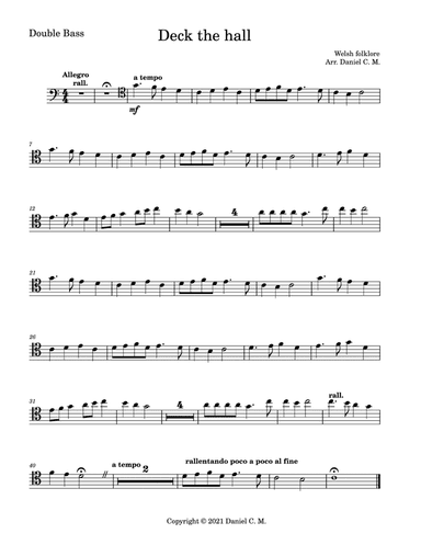 Double Bass,Piano,String Bass - Level 1 - Digital Download SKU: A0.810317 Composed by Anonymous, Welsh folklore. Arranged by Daniel C. M. Christmas,Concert,Standards. Score and part. 3 pages. Daniel C. M. #6588477. Published by Daniel C. M. (A0.810317). This is an easy arrangement for double bass and piano in the key of C major. Enjoy this timeless song written in a direct yet simple and beautiful way that could be played at a recital or Christmas gatherings. This product was created by a member of ArrangeMe, Hal Leonard’s global self-publishing community of independent composers, arrangers, and songwriters. ArrangeMe allows for the publication of unique arrangements of both popular titles and original compositions from a wide variety of voices and backgrounds. About Digital Downloads Digital Downloads are downloadable sheet music files that can be viewed directly on your computer, tablet or mobile device. Once you download your digital sheet music, you can view and print it at home, school, or anywhere you want to make music, and you don’t have to be connected to the internet. Just purchase, download and play! PLEASE NOTE: Your Digital Download will have a watermark at the bottom of each page that will include your name, purchase date and number of copies purchased. You are only authorized to print the number of copies that you have purchased. You may not digitally distribute or print more copies than purchased for use (i.e., you may not print or digitally distribute individual copies to friends or students).