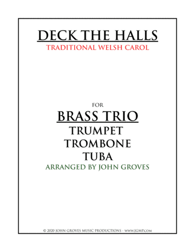 Brass Ensemble Trombone,Trumpet,Tuba - Level 4 - Digital Download SKU: A0.783187 Composed by Traditional. Arranged by John Groves. Christmas,Holiday,Traditional. Score and parts. 7 pages. John Groves #6092253. Published by John Groves (A0.783187). Deck the Halls - arranged for BRASS TRIO: Trumpet, Trombone, Tuba Score and Parts Included. This product was created by a member of ArrangeMe, Hal Leonard’s global self-publishing community of independent composers, arrangers, and songwriters. ArrangeMe allows for the publication of unique arrangements of both popular titles and original compositions from a wide variety of voices and backgrounds. About Digital Downloads Digital Downloads are downloadable sheet music files that can be viewed directly on your computer, tablet or mobile device. Once you download your digital sheet music, you can view and print it at home, school, or anywhere you want to make music, and you don’t have to be connected to the internet. Just purchase, download and play! PLEASE NOTE: Your Digital Download will have a watermark at the bottom of each page that will include your name, purchase date and number of copies purchased. You are only authorized to print the number of copies that you have purchased. You may not digitally distribute or print more copies than purchased for use (i.e., you may not print or digitally distribute individual copies to friends or students).