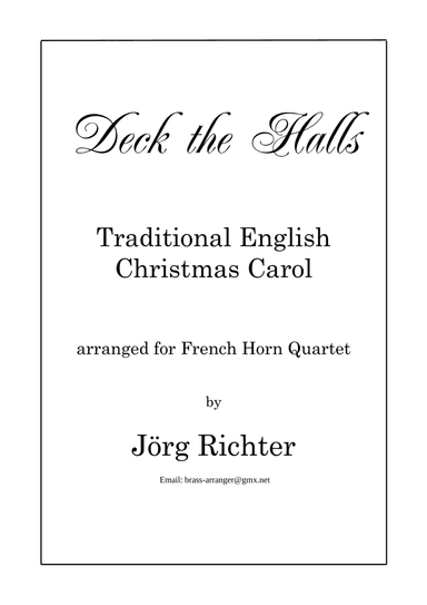 French Horn Quartet Horn - Level 4 - Digital Download SKU: A0.798799 Composed by Traditional. Arranged by Jörg Richter. Christmas,Holiday,Praise & Worship,Sacred. 6 pages. Jörg Richter #5891403. Published by Jörg Richter (A0.798799). Das alte Englische Weihnachtslied "Deck the Halls" in einem Arrangement für Horn Quartett. This product was created by a member of ArrangeMe, Hal Leonard’s global self-publishing community of independent composers, arrangers, and songwriters. ArrangeMe allows for the publication of unique arrangements of both popular titles and original compositions from a wide variety of voices and backgrounds. About Digital Downloads Digital Downloads are downloadable sheet music files that can be viewed directly on your computer, tablet or mobile device. Once you download your digital sheet music, you can view and print it at home, school, or anywhere you want to make music, and you don’t have to be connected to the internet. Just purchase, download and play! PLEASE NOTE: Your Digital Download will have a watermark at the bottom of each page that will include your name, purchase date and number of copies purchased. You are only authorized to print the number of copies that you have purchased. You may not digitally distribute or print more copies than purchased for use (i.e., you may not print or digitally distribute individual copies to friends or students).