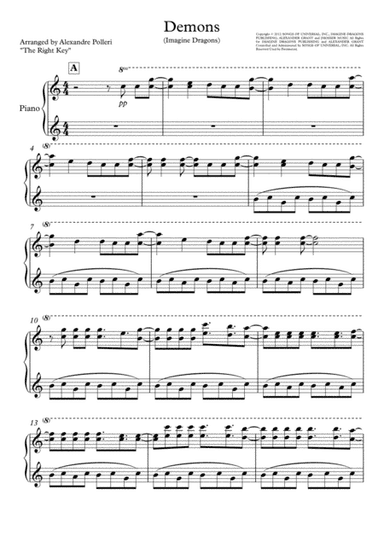 Easy Piano - Level 2 - Digital Download SKU: A0.1166277 By Imagine Dragons. By Alexander Grant, Benjamin McKee, Daniel Reynolds, Daniel Sermon, and Josh Mosser. Arranged by Dennis Cheng. Instructional,Pop,Rock. Score. 5 pages. Dennis Cheng #766658. Published by Dennis Cheng (A0.1166277). Easy beginner piano arrangement of "Demons" by Imagine Dragons for the beginner to intermediate level piano player.Knowledge of ties, dotted eigth and sixteenth note rhythms, triads, and fifths is helpful. Learn piano online from the arranger: https://www.thekeyspacenj.com/Arranger's channel: https://www.youtube.com/user/dc24fly. This product was created by a member of ArrangeMe, Hal Leonard’s global self-publishing community of independent composers, arrangers, and songwriters. ArrangeMe allows for the publication of unique arrangements of both popular titles and original compositions from a wide variety of voices and backgrounds. About Digital Downloads Digital Downloads are downloadable sheet music files that can be viewed directly on your computer, tablet or mobile device. Once you download your digital sheet music, you can view and print it at home, school, or anywhere you want to make music, and you don’t have to be connected to the internet. Just purchase, download and play! PLEASE NOTE: Your Digital Download will have a watermark at the bottom of each page that will include your name, purchase date and number of copies purchased. You are only authorized to print the number of copies that you have purchased. You may not digitally distribute or print more copies than purchased for use (i.e., you may not print or digitally distribute individual copies to friends or students).