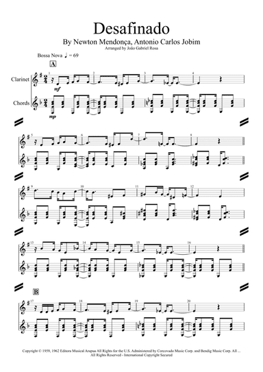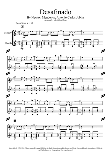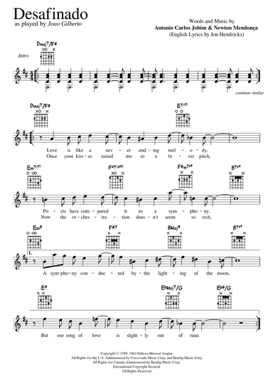 Guitar,Piano,Vocal,Voice - Level 4 - Digital Download SKU: A0.1194836 Composed by Antonio Carlos Jobim and Newton Mendonça. Arranged by John Fries. 20th Century,Jazz,Latin,Standards. Score. 2 pages. John Fries #794046. Published by John Fries (A0.1194836). TYPE JOHN FRIES IN THE SEARCH BAR TO SEE ALL I HAVE TO OFFER. Thanks, John. "Desafinado" was originally a response to critics who claimed that bossa nova was a new genre for singers who can't sing. The English language lyrics were written by Jon Hendricks and "Jessie Cavanaugh" (a pseudonym used by The Richmond Organisation). Another English lyric, more closely based on the original Portuguese lyric (but not a translation) was written by Gene Lees, and appears on some recordings as well. This product was created by a member of ArrangeMe, Hal Leonard’s global self-publishing community of independent composers, arrangers, and songwriters. ArrangeMe allows for the publication of unique arrangements of both popular titles and original compositions from a wide variety of voices and backgrounds. About Digital Downloads Digital Downloads are downloadable sheet music files that can be viewed directly on your computer, tablet or mobile device. Once you download your digital sheet music, you can view and print it at home, school, or anywhere you want to make music, and you don’t have to be connected to the internet. Just purchase, download and play! PLEASE NOTE: Your Digital Download will have a watermark at the bottom of each page that will include your name, purchase date and number of copies purchased. You are only authorized to print the number of copies that you have purchased. You may not digitally distribute or print more copies than purchased for use (i.e., you may not print or digitally distribute individual copies to friends or students).