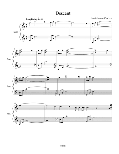 Easy Piano - Level 2 - Digital Download SKU: A0.914305 Composed by Laurie Jeanne Crockett. 20th Century,Concert,New Age. Score. 2 pages. Laurie Crockett #6535051. Published by Laurie Crockett (A0.914305). Descent - Ambient Piano SoloHaunting and powerful, this original ambient piano solo is composed at the early intermediate level to make it as relaxing to play as it is to listen to.Laurie Jeanne (ASCAP) is the two time recipient of the Individual Artist Grant, awarded by the Central New York Arts Council, and is a regular contributor to the online music library Pond5. She can also be heard on Spotify where you can check out her relaxing piano CD "A Simple Life" and her Christmas CD, "Christmas Past Christmas Present," an arrangement for piano and voice of traditional European carols such as Sans Day Carol and Coventry Carol, including several original Christmas songs. Sheet music is also available on SMP for all titles on both albums.To learn more about Laurie Jeanne and her music, please visit her website, lauriejeanne.com or her YouYube channel, Lauriejeanne Composer.You can also follow her on Spotify under the artist "Laurie Jeanne". This product was created by a member of ArrangeMe, Hal Leonard’s global self-publishing community of independent composers, arrangers, and songwriters. ArrangeMe allows for the publication of unique arrangements of both popular titles and original compositions from a wide variety of voices and backgrounds. About Digital Downloads Digital Downloads are downloadable sheet music files that can be viewed directly on your computer, tablet or mobile device. Once you download your digital sheet music, you can view and print it at home, school, or anywhere you want to make music, and you don’t have to be connected to the internet. Just purchase, download and play! PLEASE NOTE: Your Digital Download will have a watermark at the bottom of each page that will include your name, purchase date and number of copies purchased. You are only authorized to print the number of copies that you have purchased. You may not digitally distribute or print more copies than purchased for use (i.e., you may not print or digitally distribute individual copies to friends or students).