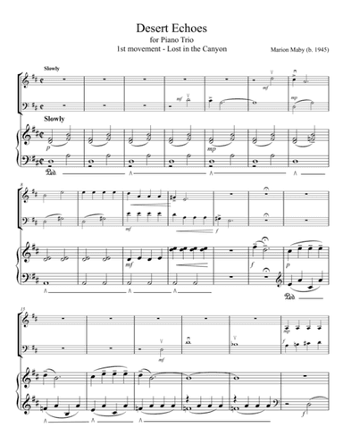 Piano Trio,String Ensemble Cello,Piano,Violin - Level 1 - Digital Download SKU: A0.726646 Composed by Marion Maby. 20th Century,Children,Instructional,Standards. Score and parts. 10 pages. M. Maby, arr. #41779. Published by M. Maby, arr. (A0.726646). Desert Echoes is an engaging piece designed for teaching the elements (and fun) of chamber music to young players. For beginning piano trio (piano, violin, cello), the music depicts being lost in a canyon (1st mvmt.) and then being rescued (2nd mvmt.) by people (cowboys? Indians?) on horseback. Melodies and motifs are dovetailed among the instruments. The piano part is playable by small hands and readable by beginner level pianists. Mvmt. I is under 2 minutes. Mvmt. II is 1.2 minutes. This product was created by a member of ArrangeMe, Hal Leonard's global self-publishing community of independent composers, arrangers, and songwriters. ArrangeMe allows for the publication of unique arrangements of popular titles and original compositions from a variety of voices and backgrounds. The length, difficulty, and retail pricing are determined solely by the discretion of the person who arranged or composed it. About Digital Downloads Digital Downloads are downloadable sheet music files that can be viewed directly on your computer, tablet or mobile device. Once you download your digital sheet music, you can view and print it at home, school, or anywhere you want to make music, and you don’t have to be connected to the internet. Just purchase, download and play! PLEASE NOTE: Your Digital Download will have a watermark at the bottom of each page that will include your name, purchase date and number of copies purchased. You are only authorized to print the number of copies that you have purchased. You may not digitally distribute or print more copies than purchased for use (i.e., you may not print or digitally distribute individual copies to friends or students).