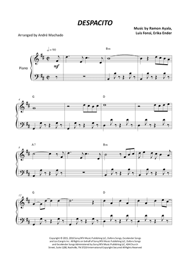 Flute Solo - Level 2 - Digital Download SKU: A0.910245 By Luis Fonsi and Daddy Yankee. By Erika Ender, Luis Fonsi, and Ramon Ayala. Arranged by Juan Arce. Latin. Individual part. 2 pages. Juan Arce #6269299. Published by Juan Arce (A0.910245). This product was created by a member of ArrangeMe, Hal Leonard's global self-publishing community of independent composers, arrangers, and songwriters. ArrangeMe allows for the publication of unique arrangements of popular titles and original compositions from a variety of voices and backgrounds. The length, difficulty, and retail pricing are determined solely by the discretion of the person who arranged or composed it. About Digital Downloads Digital Downloads are downloadable sheet music files that can be viewed directly on your computer, tablet or mobile device. Once you download your digital sheet music, you can view and print it at home, school, or anywhere you want to make music, and you don’t have to be connected to the internet. Just purchase, download and play! PLEASE NOTE: Your Digital Download will have a watermark at the bottom of each page that will include your name, purchase date and number of copies purchased. You are only authorized to print the number of copies that you have purchased. You may not digitally distribute or print more copies than purchased for use (i.e., you may not print or digitally distribute individual copies to friends or students).