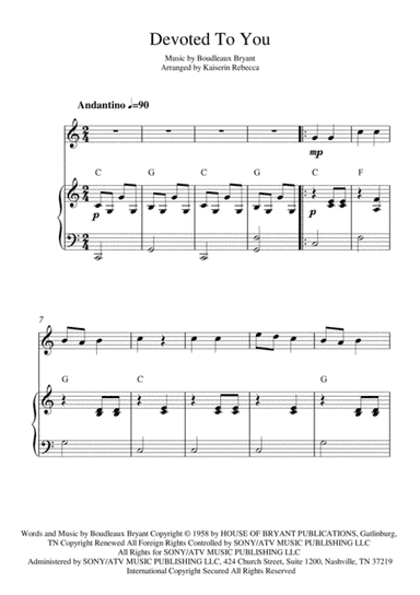 Instrumental Duet,Piano Flute,Instrumental Duet,Piano - Level 2 - Digital Download SKU: A0.642072 By The Everly Brothers. By Boudleaux Bryant. Arranged by Kaiserin Rebecca. Rock. Score and parts. 4 pages. Kaiserin Rebecca #6256541. Published by Kaiserin Rebecca (A0.642072). For flute duet and piano accompaniment with chords.Suitable for wedding, Valentine's Day and any romantic occasions.Key: C majorDuration: 2'24 This product was created by a member of ArrangeMe, Hal Leonard’s global self-publishing community of independent composers, arrangers, and songwriters. ArrangeMe allows for the publication of unique arrangements of both popular titles and original compositions from a wide variety of voices and backgrounds. About Digital Downloads Digital Downloads are downloadable sheet music files that can be viewed directly on your computer, tablet or mobile device. Once you download your digital sheet music, you can view and print it at home, school, or anywhere you want to make music, and you don’t have to be connected to the internet. Just purchase, download and play! PLEASE NOTE: Your Digital Download will have a watermark at the bottom of each page that will include your name, purchase date and number of copies purchased. You are only authorized to print the number of copies that you have purchased. You may not digitally distribute or print more copies than purchased for use (i.e., you may not print or digitally distribute individual copies to friends or students).