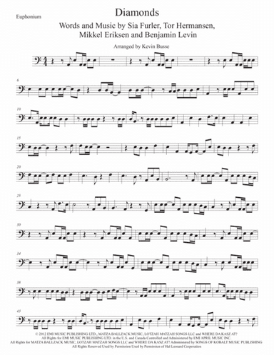 Oboe Solo - Level 2 - Digital Download SKU: A0.605893 By Rihanna. By Benjamin Levin, Mikkel Eriksen, Sia, and Tor Hermansen. Arranged by Kevin Busse. Dance,Pop,R & B. Individual part. 2 pages. Kevin Busse #4303715. Published by Kevin Busse (A0.605893). This is a simple transcription of Diamonds in a good range for Oboe. This product was created by a member of ArrangeMe, Hal Leonard's global self-publishing community of independent composers, arrangers, and songwriters. ArrangeMe allows for the publication of unique arrangements of popular titles and original compositions from a variety of voices and backgrounds. The length, difficulty, and retail pricing are determined solely by the discretion of the person who arranged or composed it. About Digital Downloads Digital Downloads are downloadable sheet music files that can be viewed directly on your computer, tablet or mobile device. Once you download your digital sheet music, you can view and print it at home, school, or anywhere you want to make music, and you don’t have to be connected to the internet. Just purchase, download and play! PLEASE NOTE: Your Digital Download will have a watermark at the bottom of each page that will include your name, purchase date and number of copies purchased. You are only authorized to print the number of copies that you have purchased. You may not digitally distribute or print more copies than purchased for use (i.e., you may not print or digitally distribute individual copies to friends or students).