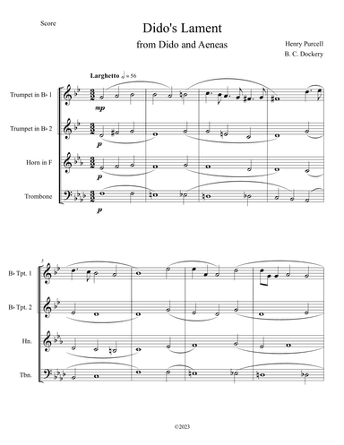 Brass Quartet Horn,Trombone,Trumpet - Level 3 - Digital Download SKU: A0.1280293 Composed by Henry Purcell. Arranged by B. C. Dockery. Baroque,Classical,Film/TV,Opera. 8 pages. Ben Dockery #871730. Published by Ben Dockery (A0.1280293). From Henry Purcell's opera Dido and Aeneas, this is "When I am laid in earth" arranged for brass quartet: two B-flat trumpets, french horn, and trombone. Great for lessons, recitals, and performances of all kinds. Intermediate level. Includes score and parts. This product was created by a member of ArrangeMe, Hal Leonard's global self-publishing community of independent composers, arrangers, and songwriters. ArrangeMe allows for the publication of unique arrangements of popular titles and original compositions from a variety of voices and backgrounds. The length, difficulty, and retail pricing are determined solely by the discretion of the person who arranged or composed it. About Digital Downloads Digital Downloads are downloadable sheet music files that can be viewed directly on your computer, tablet or mobile device. Once you download your digital sheet music, you can view and print it at home, school, or anywhere you want to make music, and you don’t have to be connected to the internet. Just purchase, download and play! PLEASE NOTE: Your Digital Download will have a watermark at the bottom of each page that will include your name, purchase date and number of copies purchased. You are only authorized to print the number of copies that you have purchased. You may not digitally distribute or print more copies than purchased for use (i.e., you may not print or digitally distribute individual copies to friends or students).