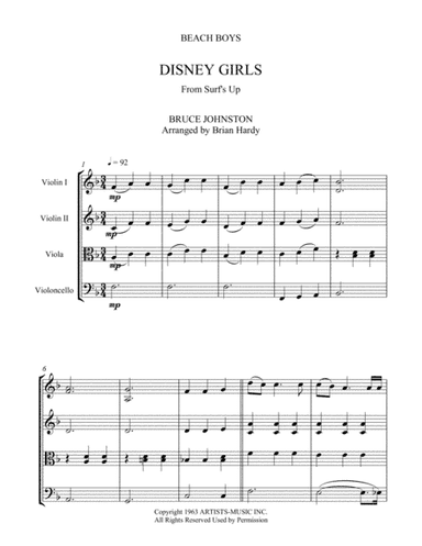 C Instrument - Level 2 - Digital Download SKU: A0.1202056 By The Beach Boys. By Bruce Johnston. Arranged by BryPiot. Contemporary,Pop. Lead Sheet / Fake Book. 6 pages. BryPiot #800678. Published by BryPiot (A0.1202056). Disney Girls (1957) by Bruce Johnston. This arrangement is The Captain & Tennille version.The Captain and TennilleBruce JohnstonThe Beach Boys. This product was created by a member of ArrangeMe, Hal Leonard's global self-publishing community of independent composers, arrangers, and songwriters. ArrangeMe allows for the publication of unique arrangements of popular titles and original compositions from a variety of voices and backgrounds. The length, difficulty, and retail pricing are determined solely by the discretion of the person who arranged or composed it. About Digital Downloads Digital Downloads are downloadable sheet music files that can be viewed directly on your computer, tablet or mobile device. Once you download your digital sheet music, you can view and print it at home, school, or anywhere you want to make music, and you don’t have to be connected to the internet. Just purchase, download and play! PLEASE NOTE: Your Digital Download will have a watermark at the bottom of each page that will include your name, purchase date and number of copies purchased. You are only authorized to print the number of copies that you have purchased. You may not digitally distribute or print more copies than purchased for use (i.e., you may not print or digitally distribute individual copies to friends or students).