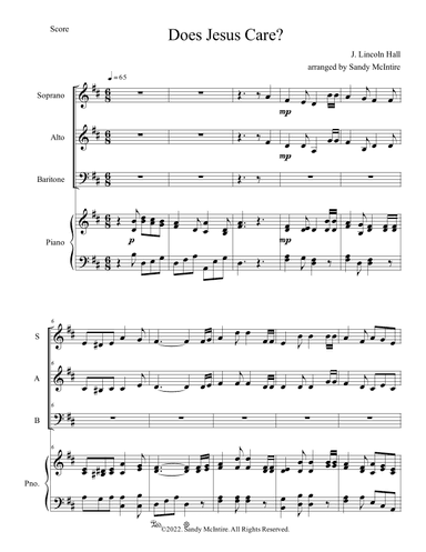 Piano Solo - Level 4 - Digital Download SKU: A0.525512 Composed by J. Lincoln Hall. Arranged by Arranged by Jenifer Cook. Christian,Gospel,Sacred,Spiritual. Score. 3 pages. Jenifer Cook #2031339. Published by Jenifer Cook (A0.525512). Early advanced sacred piano solo, 2 & 1/2 pgs. Approx. 1:34 This Medley includes two songs: "Does Jesus Care with God Will Take Care of You" Very suitable for a funeral, offertory or invitation. *Also available in the Funeral Hymn Collection by Jenifer Cook. This product was created by a member of ArrangeMe, Hal Leonard's global self-publishing community of independent composers, arrangers, and songwriters. ArrangeMe allows for the publication of unique arrangements of popular titles and original compositions from a variety of voices and backgrounds. The length, difficulty, and retail pricing are determined solely by the discretion of the person who arranged or composed it. About Digital Downloads Digital Downloads are downloadable sheet music files that can be viewed directly on your computer, tablet or mobile device. Once you download your digital sheet music, you can view and print it at home, school, or anywhere you want to make music, and you don’t have to be connected to the internet. Just purchase, download and play! PLEASE NOTE: Your Digital Download will have a watermark at the bottom of each page that will include your name, purchase date and number of copies purchased. You are only authorized to print the number of copies that you have purchased. You may not digitally distribute or print more copies than purchased for use (i.e., you may not print or digitally distribute individual copies to friends or students).