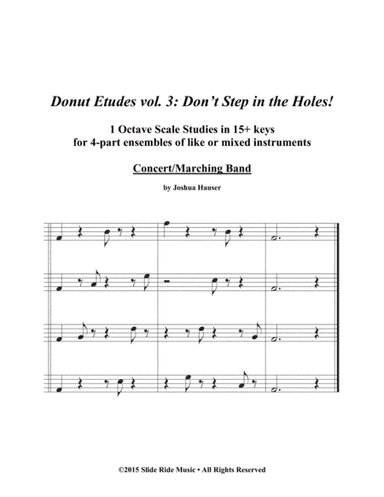 Concert Band - Level 3 - Digital Download SKU: A0.784346 Composed by Joshua Hauser. Instructional. Score and parts. 507 pages. Slide Ride #5288703. Published by Slide Ride (A0.784346). 1 Octave Scale Studies in 15+ keys for 4-part ensembles of like or mixed instruments If this is your first exposure to these scale studies, you are in for a treat! Donuts, if you make a mistake!The initial incarnation of these studies were written for trombone quartet and we would play them in the Tennessee Tech Trombone Choir with the challenge that whomever made the first mistake had to buy donuts for the rest of the ensemble. Since then I have brought that version to several clinics and warm up sessions. One time before I got to explain the title, a fellow trombone professor said, "Oh, I get it! Don’t step in the holes!"I only wish I had thought of that myself... Since we have one of the best donut shops in TN here in Cookeville, treating the studio to sugar coated goodies was always my intent.As with those initial exercises, you can vary these as much as you’d like.·     Choose a tempo.·     Choose a dynamic.·     Choose an articulation/style.One way I like to play these is to have one person be the model, playing the entire scale over and over while everyone else plays the fragmented versions. That helps everyone to keep on track and stay in time. Double or triple up the parts for ensemble cohesion with a larger group.Practice one key, gradually speeding it up to improve fluidity, or choose a variation and take it through all keys, playing version A, B, C, or D then skipping to play the same set in a new key.If you want an additional challenge, play them in different octaves or change the key. Play the F Major set in f minor (all forms), different modes, etc. Players really have to be on their toes to remember if they are playing melodic minor in the ascending or descending form! For jazz players, try swinging them in dorian or mixolydian modes.The variations are endless!If you are using these with transposing instruments, 1) is F Major in Concert Pitch, 2) is Bb Major in Concert pitch, and so on. When you reach a scale that is enharmonic for another key (Db/C#, Gb/F#, or Cb/B), they are presented in both keys for each instrument so Trumpets can play in Eb while the Flutes are playing in C# with similar examples for all keys.All Donut Etudes with the same volume number are compatible so you can play them in mixed quartets or large ensembles with one or more instruments/people on part 1 and a different instrument on part 2, etc. Since the quartets are all identical, conductors/coaches can use any of the scores to tell which part should be playing at what time. Once you have played a scale with one set of parts, everyone can rotate to a different part and play the same scales again!Enjoy! This product was created by a member of ArrangeMe, Hal Leonard’s global self-publishing community of independent composers, arrangers, and songwriters. ArrangeMe allows for the publication of unique arrangements of both popular titles and original compositions from a wide variety of voices and backgrounds. About Digital Downloads Digital Downloads are downloadable sheet music files that can be viewed directly on your computer, tablet or mobile device. Once you download your digital sheet music, you can view and print it at home, school, or anywhere you want to make music, and you don’t have to be connected to the internet. Just purchase, download and play! PLEASE NOTE: Your Digital Download will have a watermark at the bottom of each page that will include your name, purchase date and number of copies purchased. You are only authorized to print the number of copies that you have purchased. You may not digitally distribute or print more copies than purchased for use (i.e., you may not print or digitally distribute individual copies to friends or students).
