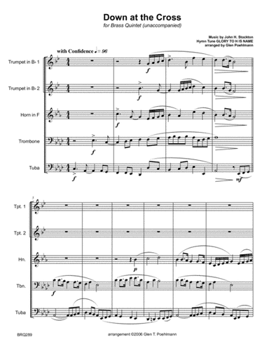 Brass Ensemble - Level 4 - Digital Download SKU: A0.806991 Composed by John Hart Stockton. Arranged by Glen Poehlmann. Christian,Easter,Sacred. Score and parts. 18 pages. Arrangements by GPoehlmann #6207045. Published by arrangements by GPoehlmann (A0.806991). DOWN AT THE CROSS - BRASS QUINTET (unaccompanied)aka Glory To His Name. Baritone Treble Clef part included as an alternate for the Trombone.87 measures.   Performance Time approx. 3:10.   Medium Difficult (Grade 3+)Key: Ab - Bb.   Meter:4/4 - 6/8.   Instrument Ranges (C4=middle C):Trumpet 1 C4 - G5 (written).   Trumpet 2 Bb3 - Eb5 (written).   Horn in F A3 - F5 (written).Trombone Bb2 - G4 or Baritone tC C4 - A5 (written).   Tuba Bb1 - G3 This product was created by a member of ArrangeMe, Hal Leonard's global self-publishing community of independent composers, arrangers, and songwriters. ArrangeMe allows for the publication of unique arrangements of popular titles and original compositions from a variety of voices and backgrounds. The length, difficulty, and retail pricing are determined solely by the discretion of the person who arranged or composed it. About Digital Downloads Digital Downloads are downloadable sheet music files that can be viewed directly on your computer, tablet or mobile device. Once you download your digital sheet music, you can view and print it at home, school, or anywhere you want to make music, and you don’t have to be connected to the internet. Just purchase, download and play! PLEASE NOTE: Your Digital Download will have a watermark at the bottom of each page that will include your name, purchase date and number of copies purchased. You are only authorized to print the number of copies that you have purchased. You may not digitally distribute or print more copies than purchased for use (i.e., you may not print or digitally distribute individual copies to friends or students).