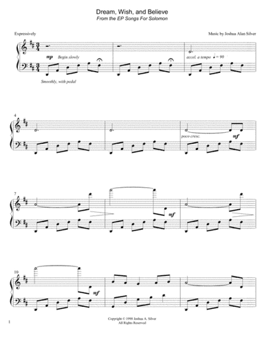 Piano Solo - Digital Download SKU: A0.1032447 Composed by Joshua Alan Silver. New Age. Score. 5 pages. Joshua Silver Music Productions #4811025. Published by Joshua Silver Music Productions (A0.1032447). The hit track from Joshua Alan Silver's 2018 EP Songs For Solomon, "Dream, Wish, and Believe" is an uplifting and timelessly inspirational work of music for solo piano. This product was created by a member of ArrangeMe, Hal Leonard's global self-publishing community of independent composers, arrangers, and songwriters. ArrangeMe allows for the publication of unique arrangements of popular titles and original compositions from a variety of voices and backgrounds. The length, difficulty, and retail pricing are determined solely by the discretion of the person who arranged or composed it. About Digital Downloads Digital Downloads are downloadable sheet music files that can be viewed directly on your computer, tablet or mobile device. Once you download your digital sheet music, you can view and print it at home, school, or anywhere you want to make music, and you don’t have to be connected to the internet. Just purchase, download and play! PLEASE NOTE: Your Digital Download will have a watermark at the bottom of each page that will include your name, purchase date and number of copies purchased. You are only authorized to print the number of copies that you have purchased. You may not digitally distribute or print more copies than purchased for use (i.e., you may not print or digitally distribute individual copies to friends or students).