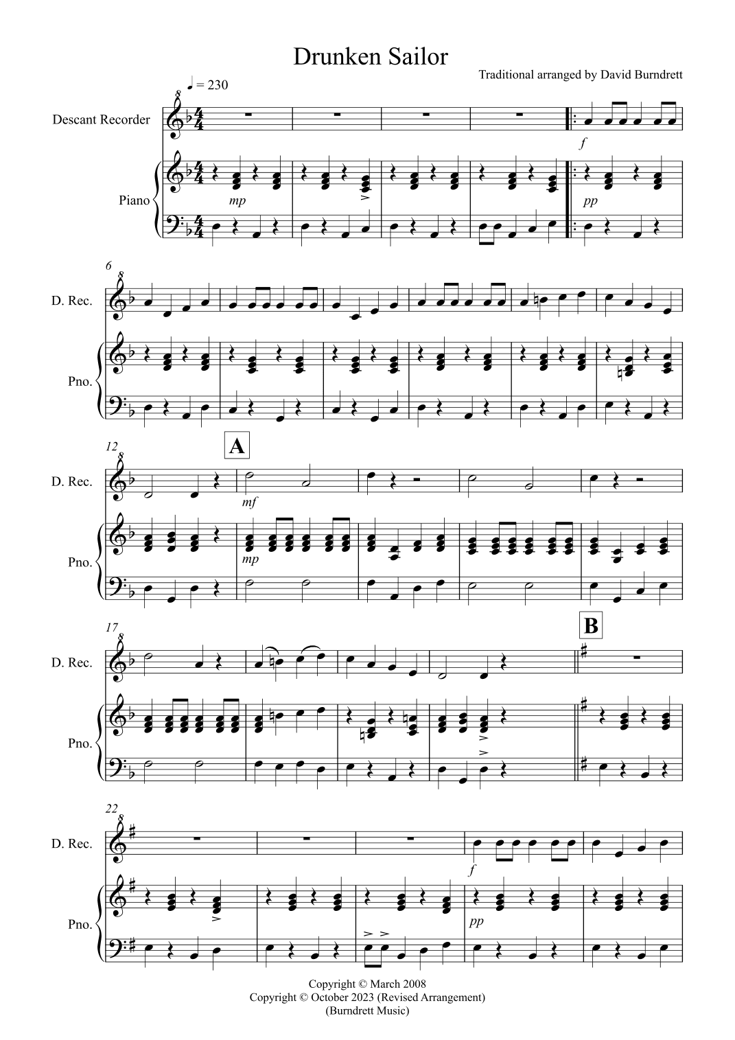 Drunken Sailor for Descant Recorder and PIano (arr. David Burndrett)