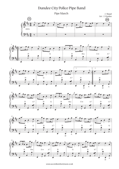 Accordion,Instrumental Solo - Digital Download SKU: A0.1115647 Composed by J. Shand. Arranged by Julia Gordon. Celtic,Folk,Irish,Multicultural,World. Individual part. 2 pages. Julia Gordon #717417. Published by Julia Gordon (A0.1115647). A Scottish pipe march arranged for accordion. This product was created by a member of ArrangeMe, Hal Leonard’s global self-publishing community of independent composers, arrangers, and songwriters. ArrangeMe allows for the publication of unique arrangements of both popular titles and original compositions from a wide variety of voices and backgrounds. About Digital Downloads Digital Downloads are downloadable sheet music files that can be viewed directly on your computer, tablet or mobile device. Once you download your digital sheet music, you can view and print it at home, school, or anywhere you want to make music, and you don’t have to be connected to the internet. Just purchase, download and play! PLEASE NOTE: Your Digital Download will have a watermark at the bottom of each page that will include your name, purchase date and number of copies purchased. You are only authorized to print the number of copies that you have purchased. You may not digitally distribute or print more copies than purchased for use (i.e., you may not print or digitally distribute individual copies to friends or students).