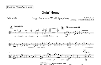 Viola Solo - Level 3 - Digital Download SKU: A0.754772 Composed by Antonin Dvorak. Arranged by Randy Calistri-Yeh. Classical,Romantic Period,Spiritual. Individual part. 1 pages. Custom Chamber Music #362523. Published by Custom Chamber Music (A0.754772). This solo is included in the collection "Pure Viola Volume 1" (click the Custom Chamber Music publisher link above).The 2nd movement of Dvorak's New World Symphony is often played on its own under the name "Goin' Home". This arrangement for solo viola is adapted from a violin arrangement by Fritz Kreisler. The lower key and lower instrument range fits perfectly with the spiritual aspect of the music. This is for solo performance - no piano accompaniment needed. This product was created by a member of ArrangeMe, Hal Leonard's global self-publishing community of independent composers, arrangers, and songwriters. ArrangeMe allows for the publication of unique arrangements of popular titles and original compositions from a variety of voices and backgrounds. The length, difficulty, and retail pricing are determined solely by the discretion of the person who arranged or composed it. About Digital Downloads Digital Downloads are downloadable sheet music files that can be viewed directly on your computer, tablet or mobile device. Once you download your digital sheet music, you can view and print it at home, school, or anywhere you want to make music, and you don’t have to be connected to the internet. Just purchase, download and play! PLEASE NOTE: Your Digital Download will have a watermark at the bottom of each page that will include your name, purchase date and number of copies purchased. You are only authorized to print the number of copies that you have purchased. You may not digitally distribute or print more copies than purchased for use (i.e., you may not print or digitally distribute individual copies to friends or students).