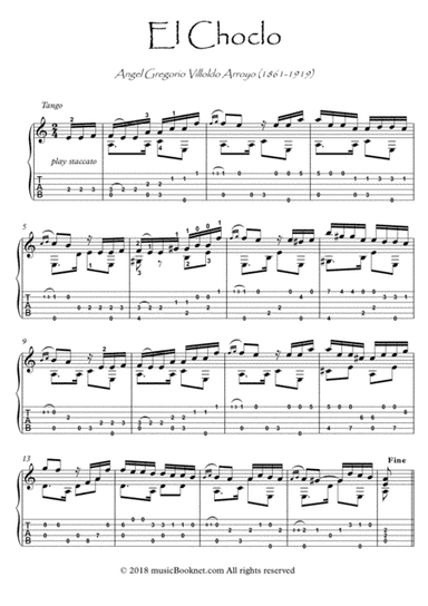 Guitar - Level 3 - Digital Download SKU: A0.556496 Composed by Angel Villoldo. Arranged by PianoSheetNow. 20th Century,Classical,Contemporary,Latin,Romantic Period. Guitar Tab. 2 pages. PianoSheetNow #3618719. Published by PianoSheetNow (A0.556496). El Choclo, one of the most popular tangos in Argentina, is a popular song written by Angel Villoldo (1861-1919), an Argentine musician. For Classical Guitar solo. Intermediate.With Tablature. With downloadable mp3 just for audio help.Pages: two pages, 2:10 min. This product was created by a member of ArrangeMe, Hal Leonard's global self-publishing community of independent composers, arrangers, and songwriters. ArrangeMe allows for the publication of unique arrangements of popular titles and original compositions from a variety of voices and backgrounds. The length, difficulty, and retail pricing are determined solely by the discretion of the person who arranged or composed it. About Digital Downloads Digital Downloads are downloadable sheet music files that can be viewed directly on your computer, tablet or mobile device. Once you download your digital sheet music, you can view and print it at home, school, or anywhere you want to make music, and you don’t have to be connected to the internet. Just purchase, download and play! PLEASE NOTE: Your Digital Download will have a watermark at the bottom of each page that will include your name, purchase date and number of copies purchased. You are only authorized to print the number of copies that you have purchased. You may not digitally distribute or print more copies than purchased for use (i.e., you may not print or digitally distribute individual copies to friends or students).