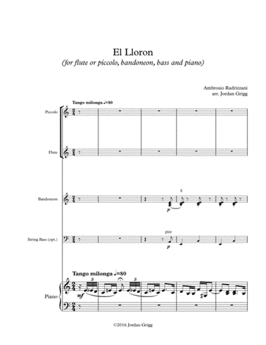 Double Bass,Flute,Piano - Digital Download SKU: A0.1057155 Composed by Ambrosio Radrizzani. Arranged by Jordan Grigg. 20th Century,Concert,Instructional,Standards,World. Full Performance. Duration 99. Jordan Grigg #3461921. Published by Jordan Grigg (A0.1057155). This product was created by a member of ArrangeMe, Hal Leonard's global self-publishing community of independent composers, arrangers, and songwriters. ArrangeMe allows for the publication of unique arrangements of popular titles and original compositions from a variety of voices and backgrounds. The length, difficulty, and retail pricing are determined solely by the discretion of the person who arranged or composed it. About MP3s at Sheet Music Plus You can now purchase MP3s for download from Sheet Music Plus! You'll find a variety of MP3s from instrumental play alongs to choral accompaniment tracks to great new music from emerging and established artists. After purchase, you can download your MP3 from your Sheet Music Plus Digital Library - no software installation is necessary! You can also listen to your MP3 at any time in your Digital Library.